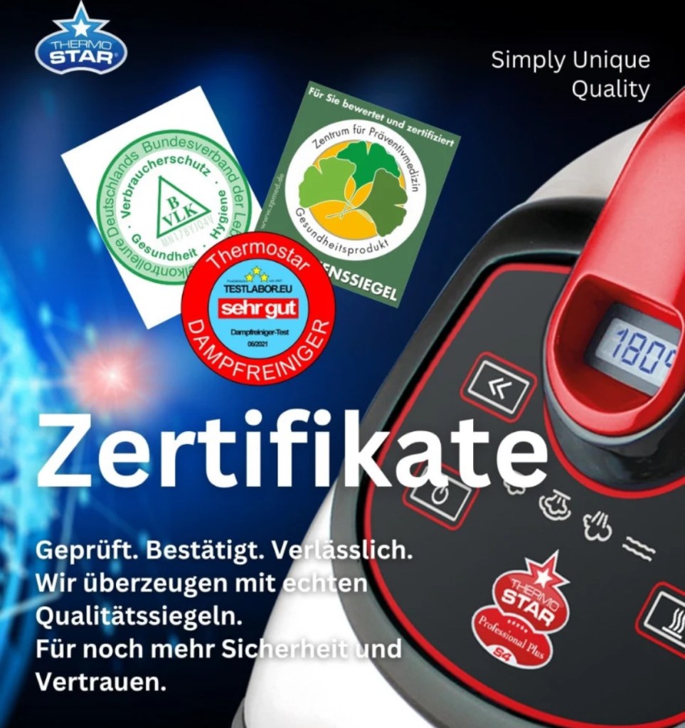 Der Thermostar-Dampfreiniger ist nicht nur leistungsstark, sondern auch gesundheitsbewusst: Er trägt das Zertifikat für medizinische Sauberkeit und erfüllt höchste Hygiene-Standards.